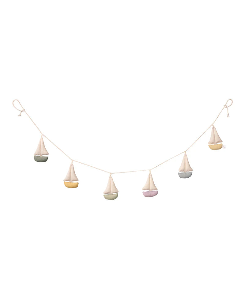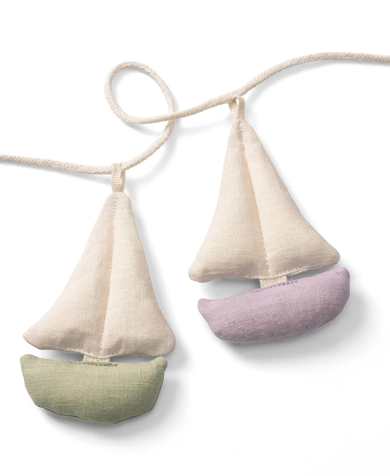 Bring the whimsical charm of sailing adventures into your child’s space with this delightful Boats Garland. Featuring six handcrafted sailboats in soft shades of green, yellow, and blue, this garland adds a playful nautical touch wherever it’s placed—whether draped over a canopy bed, hung above a cot, or styled as a cheerful wall or window decoration.